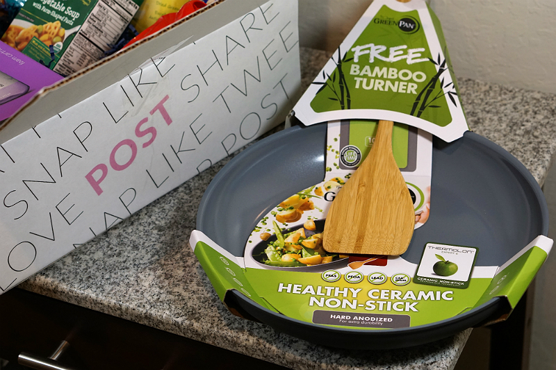 This “Hosting & Toasting Edition” BabbleBoxx contained a Simplehuman Foaming Soap Dispenser, Snack Factory Original Pretzel Crisps, Sunsweet Pacific Tropicals, LaCroix Sparkling Water, Wild Garden Quick Marinade and Heat & Serve Pilaf, Annie’s Homegrown Organic Kid Soup, Ella’s Kitchen The Red One Juice Box, and a GreenPan 10″ Fry Pan and Bamboo Turner.