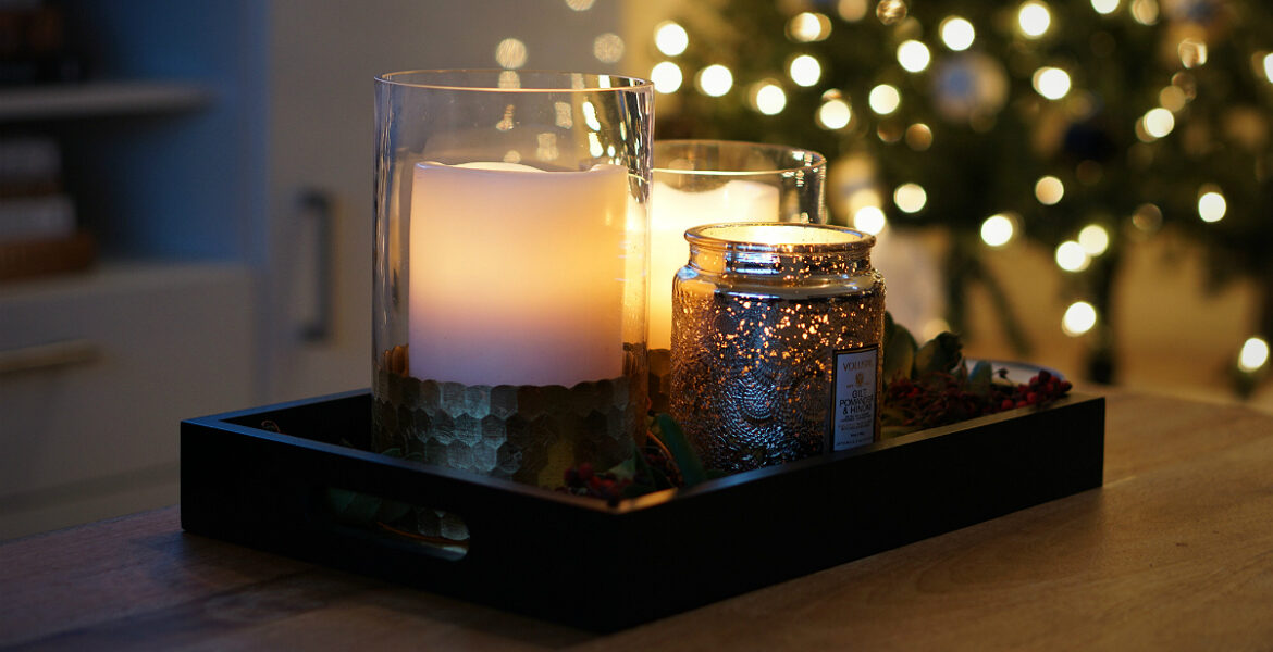 To create a warm and inviting atmosphere, light scented candles (such as our favorite Voluspa candle) and turn-on your twinkling tree lights. If you have a fireplace, get a roaring fire going, which encourages your guests to stay cozy and warm, while enjoying your company.