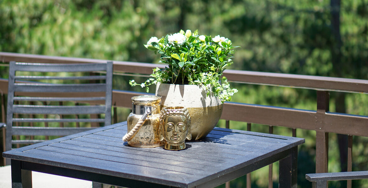 STEP 5: Ornamental accessories add an embellished look to your patio table. Choose accessories that inspire you (like this gold mini Buddha statue) and add candles for a magical, romantic touch. Opt for naturally-scented candles (such as a pine scent), or go for bug-repelling scents (like citronella), if you prefer.
