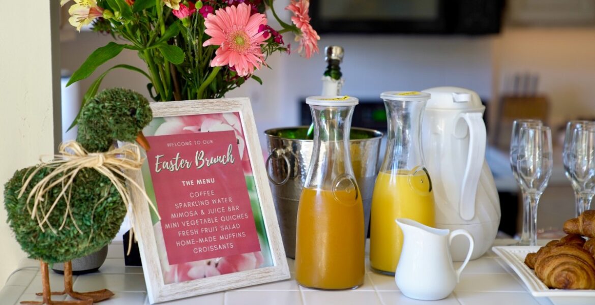 In regards to Easter brunch dishes, keep things low-key and effortless with an assortment of easy-to-make options. Store-bought croissants, hearty homemade muffins, crustless vegetable mini quiches, and fruit salad are delicious food options to serve. Plus, these can be made in advance of Easter, allowing you to relax the day of.